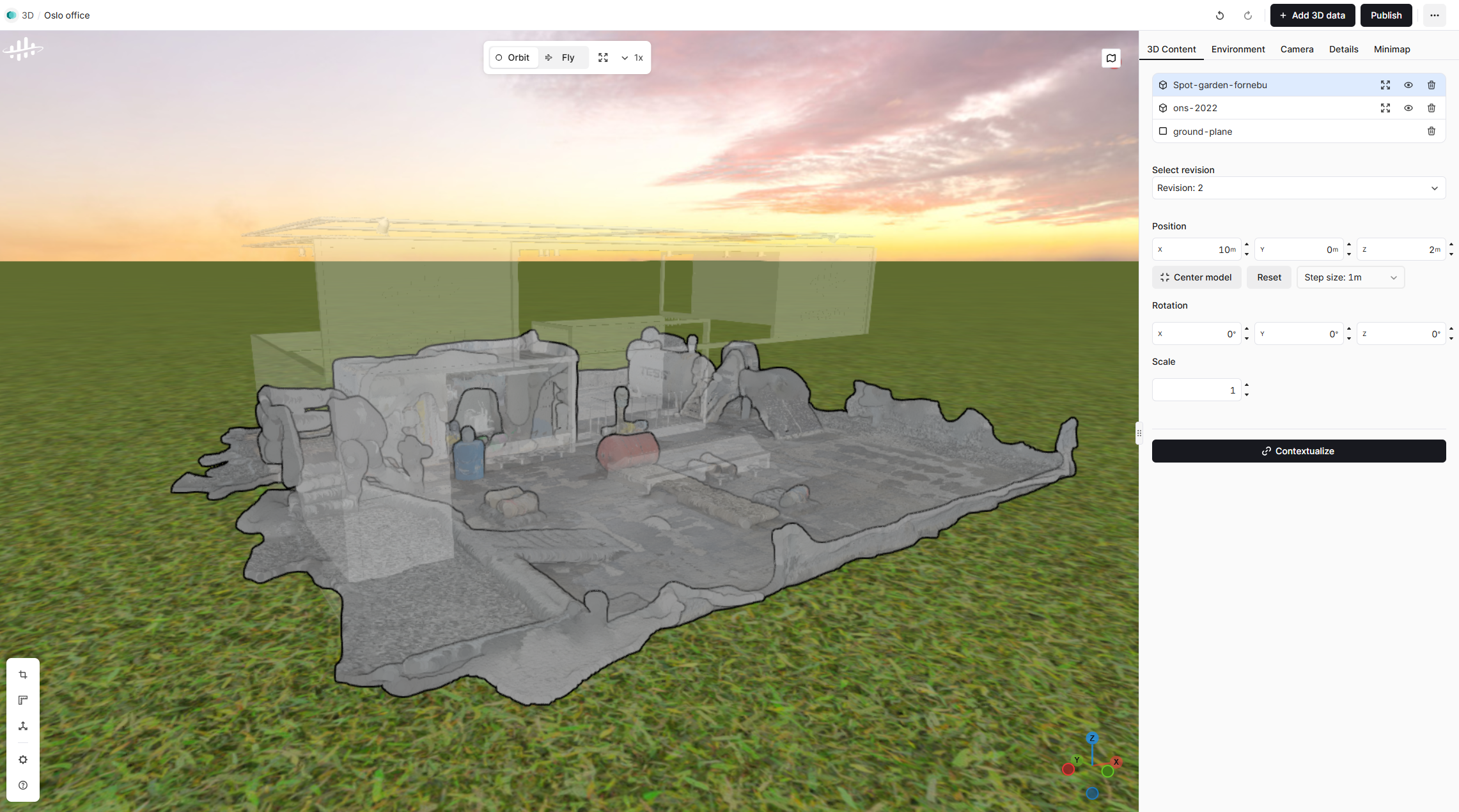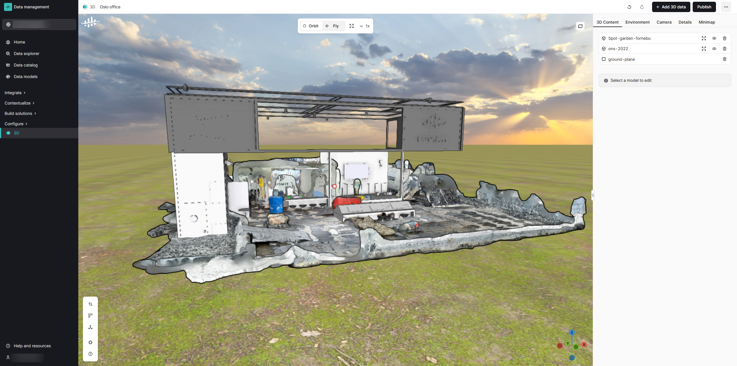 You can contextualize 3D objects (CAD, point cloud, or 360° images) within a scene using the unified 3D contextualization editor. To start contextualizing: