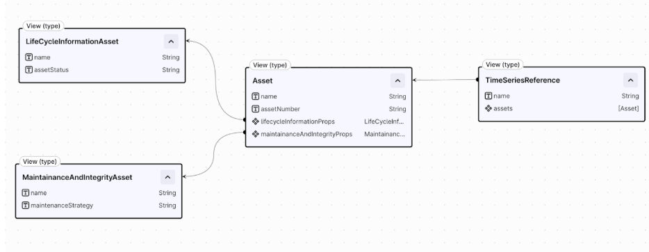Split properties for the same instance across multiple, context-specific containers and views. This ensures compliance with the 300-property view limit and improves AI accuracy by restricting the view to only context-relevant properties. For example, a property like pipe coating would be excluded from a view focused on pump equipment.Model relationships
