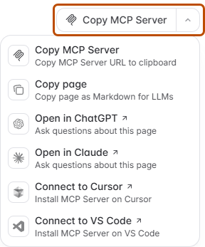 Click the Copy MCP Server button at the top right of any documentation page. This opens a dropdown menu with connection options.